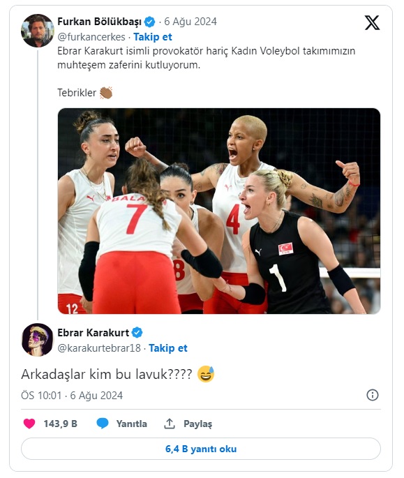 2024 Paris Olimpiyat Oyunları’nda Türkiye A Milli Kadın Voleybol Takımı çeyrek finalde Çin’i 3 – 2 yenerek yarı finale kalmasının ardından AKP trolü olarak bilinen Furkan Bölükbaşı’nın sosyal medyadan yaptığı paylaşımda “Ebrar Karakurt isimli provokatör hariç Kadın Voleybol takımımızın muhteşem zaferini kutluyorum” sözleri büyük tepki çekti.