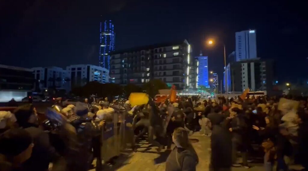 İmamoğlu’nun gözaltına alınmasına tepki gösteren İzmir’de eğitim gören öğrenciler Bornova Büyükpark’ta buluştu. AKP İl Başkanlığı önüne gitmek isteyen öğrenciler polis barikatıyla karşılaştı. Yönünü değiştiren öğrenciler il binasına arkadan gitmeye çalıştı. Polis ile karşı karşıya gelen göstericiler bariyeri yıktı.