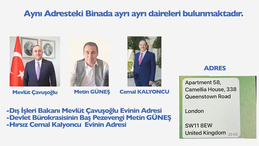 Muhammet Yakut’un açıklamalarına göre Dışişleri Bakanı Mevlüt Çavuşoğlu, onun Haiti Fahri Konsolosu olarak atadığı Metin Güneş ve iktidara yakın iş insanı Cemal Kalyoncu, çaldıkları paralarla Londra’da ev almış. Yakut, evin adresini de verdi.