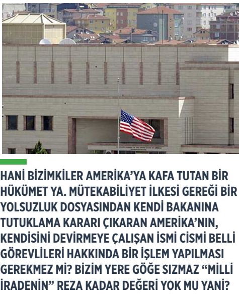 Hani bizimkiler Amerika’ya kafa tutan bir hükümet ya. Mütekabiliyet ilkesi gereği bir yolsuzluk dosyasından kendi bakanına tutuklama kararı çıkaran Amerika’nın, kendisini devirmeye çalışan ismi cismi belli görevlileri hakkında bir işlem yapılması gerekmez mi? Bizim yere göğe sızmaz “milli iradenin” Reza kadar değeri yok mu yani?