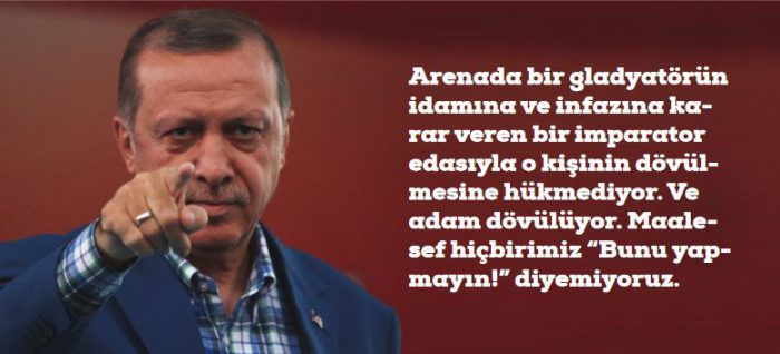 Herkes şok olmuştu. Ta ilk günden başlayarak Erdoğan ile beraber yürüyen etkin bir kişiden böyle bir çıkış beklemiyordu. Merakla kulak kabarttılar. Bakan devam etti: “Güçlendikçe kendini kaybediyor. Kimse de onu uyaramıyor.” Duyduklarına inanmakta güçlük çeken Avrupalı konuklar, Bakan Bey’in anlattığı konunun somut olaylara dayanıp dayanmadığını merak edince Bakan Bey akılları donduracak bir vakayı nakleder: Geçenlerde kafile halinde bir yerlere gidiyorlar. Dışarıdaki bir adamdan hoşlanmıyor. Arabayı durduruyor. Korumalar pür dikkat bekleşmekte. Arabanın camı açılıyor. Erdoğan baş parmağını yukarıya doğru kaldırmış durumda. Sonra yavaş yavaş parmağını aşağıya doğru indiriyor. Arenada bir gladyatörün idamına ve infazına karar veren bir imparator edasıyla o kişinin dövülmesine hükmediyor. Ve adam dövülüyor. Maalesef hiçbirimiz “Bunu yapmayın!” diyemiyoruz.