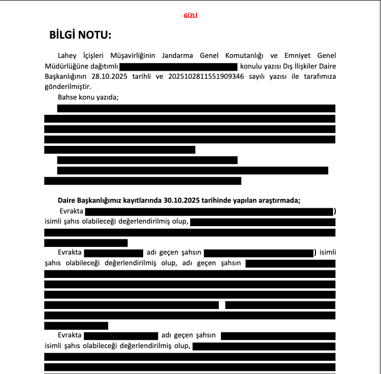 İçişleri ve Emniyet’in 30 Eylül 2025 tarihli gizli yazılarında, yurtdışından gelen istihbaratın “kesinlikle paylaşılmaması”, sadece ilgili il emniyetine ve yerel istihbarat birimlerine iletilmesi talimatı veriliyor. Bu, operasyonun diplomatik skandal riskinin bilindiğini ortaya koyuyor.