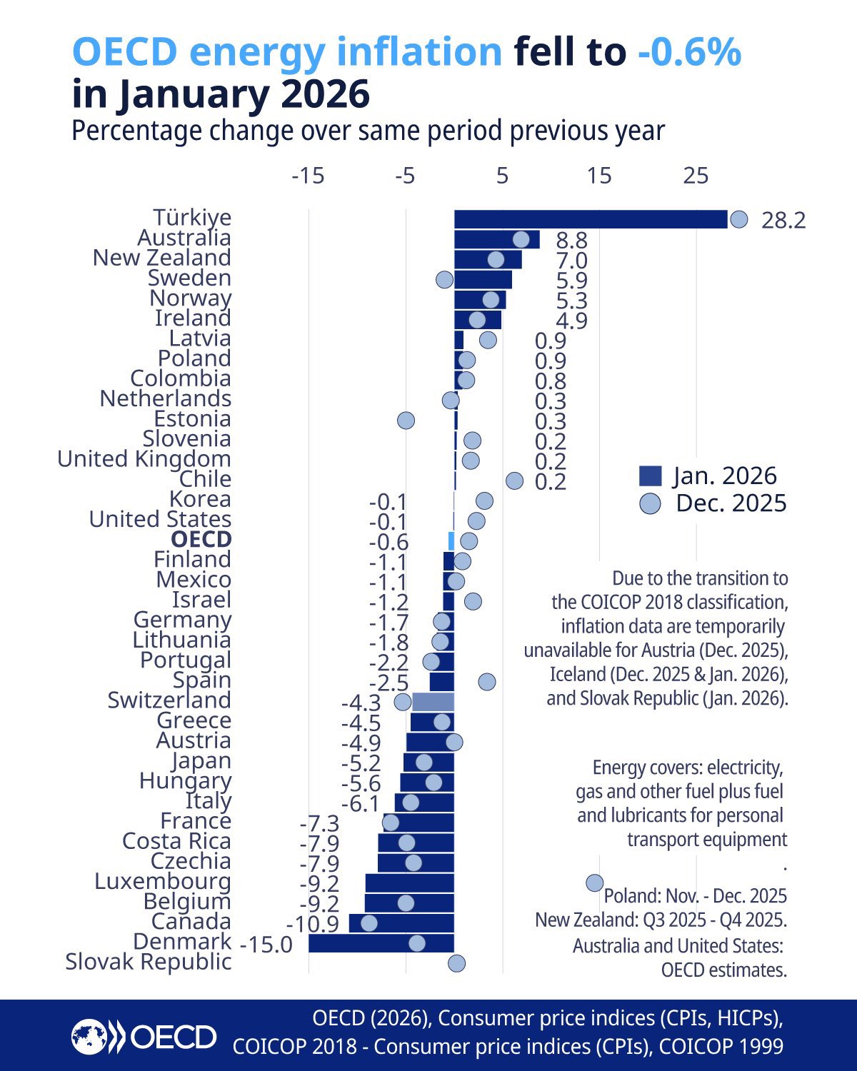 Ekonomik İşbirliği ve Kalkınma Örgütü’nün (OECD) yayımladığı enerji enflasyonu verileri, 2026 yılına girilirken küresel ölçekte enerji fiyatlarında düşüş eğiliminin güçlendiğini gösteriyor. Ocak 2026 itibarıyla OECD genelinde enerji enflasyonu yıllık bazda yüzde -0,6’ya gerileyerek negatif bölgeye indi. Ancak Türkiye bu eğilimden tamamen ayrıştı. Türkiye’de enerji enflasyonu yüzde 28,2 olarak gerçekleşti ve OECD ülkeleri arasında açık ara en yüksek artış kaydedildi. En yakın ülke olan Avustralya’da bile artış yüzde 8,8 seviyesinde kaldı.