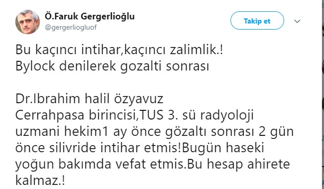 Bu olayın sosyal medya hesabından haber veren eski Mazlum-Der Başkanı ve HDP Milletvekili adayı Ömer Faruk Gergerlioğlu, “Bu kaçıncı intihar,kaçıncı zalimlik.! Bylock denilerek gozalti sonrası. Dr.Ibrahim halil özyavuz . Cerrahpasa birincisi,TUS 3. sü radyoloji uzmani hekim1 ay önce gözaltı sonrası 2 gün önce silivride intihar etmis!Bugün haseki yoğun bakımda vefat etmis.Bu hesap ahirete kalmaz.!” ifadelerini kullandı.