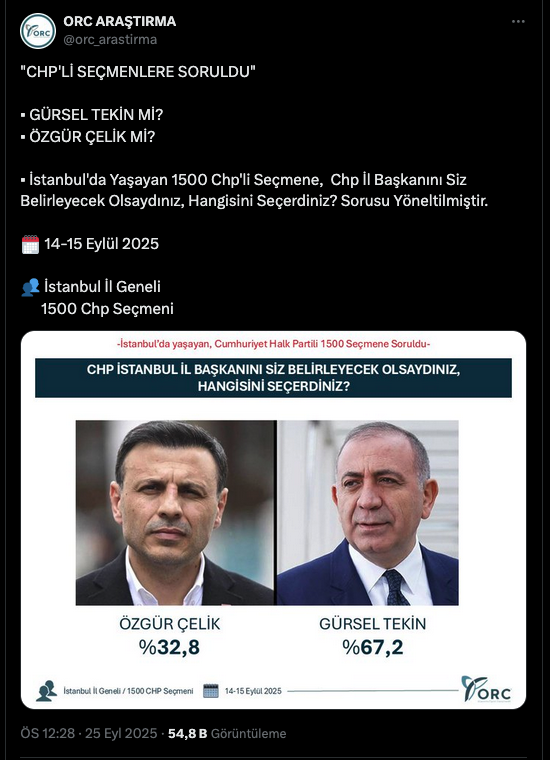ORC Araştırma, 1500 CHP seçmenine sorarak 14-15 Eylül 2025 tarihlerinde yaptığı ankette, “CHP İl Başkanını siz belirleyecek olsaydınız, hangisini seçerdiniz?” diye sordu. Anket sonuçlarına göre, katılımcıların yüzde 32,8’i “Özgür Çelik”; yüzde 67,2’si ise Gürsel Tekin cevabnı verdi.