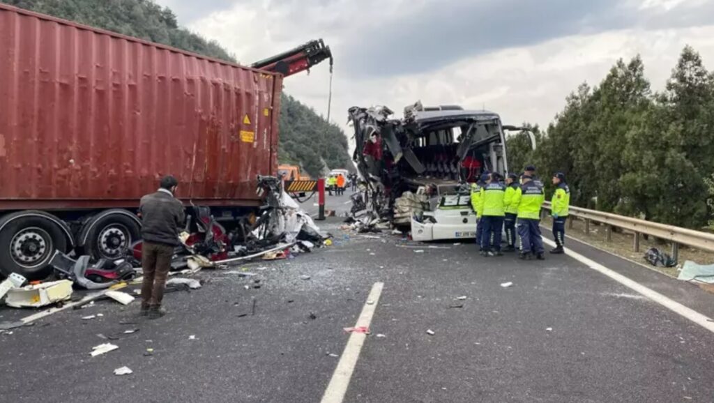 Lastiği patladığı için TIR’ın sağ şeritte durduğu belirlenirken, otoyol bir süre araç trafiğine kapatıldı. Kazada demir yığınına dönen otobüs, yapılan incelemenin ardından çekici ile çekilip, otoyol kontrollü olarak araç trafiğine açıldı.