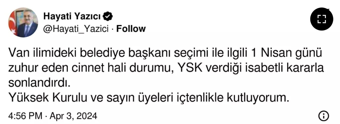 Zeydan’ın başkanlığının elinden alınmasını kimi AK Partililer eleştiri yoluna gitti. Uygulamanın YSK eliyle düzeltilmesi üzerine bazı isimler de “yanlıştan dönüldüğü” yolunda mesajlar verdi. AK Parti Genel Başkan Yardımcısı Hayati Yazıcı da bu isimlerden biriydi. Yazıcı, “Van ilimizdeki belediye başkanı seçimi ile ilgili 1 Nisan günü zuhur eden cinnet hali durumu, YSK verdiği isabetli kararla sonlandırdı” diye bir paylaşım yaptı.