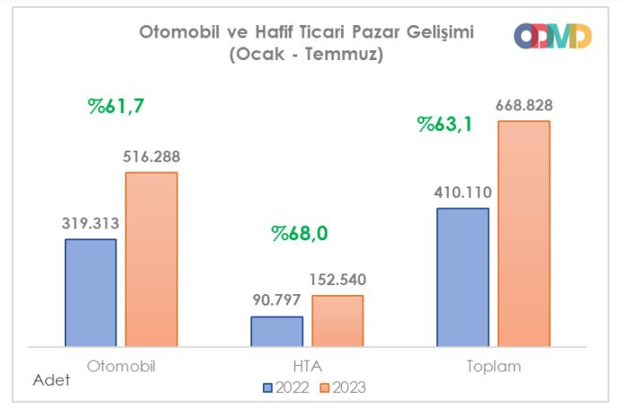 Otomotiv Distribütörleri ve Mobilite Derneği (ODMD) verilerine göre Temmuz’da hafif ticari ve otomobil pazarı yüzde 115,4 büyüyerek 112 bin 459 adet oldu. İlk 7 ayda toplam otomotiv pazarı yüzde 63,1 oranında büyüyerek 668 bin 828 adete ulaştı.