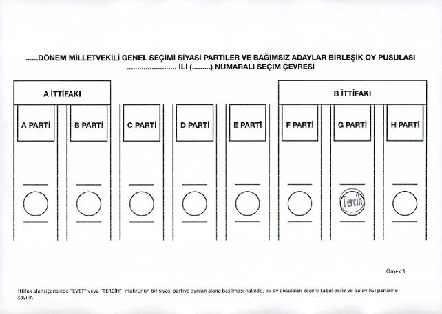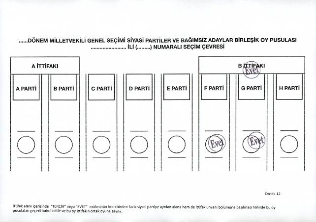 Pusulada yalnızca tek bir partiye mühür basılmışsa, oy o partiye yazılacak. Pusulada yalnızca ittifakın adının olduğu bölüme mühür vurulmuşsa, ‘ortak oy’ sayılacak. Pusulada hem ittifaka hem de tek bir partiye mühür vurulmuşsa, oy o partiye verilmiş kabul edilecek ve partinin hanesine yazılacak. Mühür ittifak bölümüne taşacak şekilde parti alanına vurulmuşsa yine o partiye verilmiş sayılacak. Pusulada hem ittifaka hem de birden çok partiye mühür basılmışsa, o oy‘ortak oy’ hanesine yazılacak.