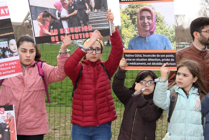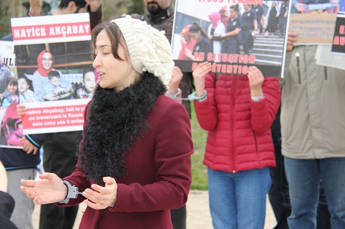 Darbe bahanesiyle cezaevlerine atılan kadın ve çocuk sayısının asker sayısından fazla olduğuna dikkat çeken aktivisler, yaşanan zulmü vicdan ve aklın kabul edemeyeceğini söyledi. İnsanlara ‘Kadın ve bebekleri hapse atmak hangi dinde hangi kültürde var. Lütfen bunu sorgulamayın.’ çağrısı yapılan eyleme çocuklarda katıldı. Bileklerine kelepçe takan çocuklar Parislilere arkadaşlarının mağduriyetini duyurdu.