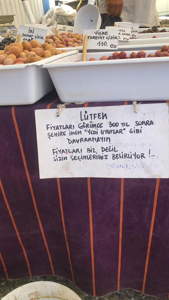 “Lütfen. Fiyatları görünce 300 yıl sonra şehire inen ‘Yedi Uyurlar’ gibi davranmayın. Fiyatları biz değil sizin seçimleriniz belirliyor.”