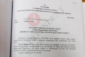 ‘‘Şüpheli Sezen Ataş ve ekli nüfus kaydına göre kendisi ve eşi adına FETÖ/PDY silahlı terör örgütüne müzahir Bank Asya da herhangi bir hesap veya işlemleri bulunup bulunmadığı, bulunuyor ise hesap hareket ve dökümlerinin en kısa süre içerisinde Cumhuriyet Başsavcılığımıza gönderilmesi hususunda gereğini bilgilerinize rica ederim.’’