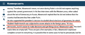 Pevçih ayrıca Abramoviç’in Putin tarafından bizzat Chukotka bölgesinin valisi olarak atandığını (2000-2008) ve vali seçimlerinin kaldırılmasını aktif olarak desteklediğini hatırlatıyor.
