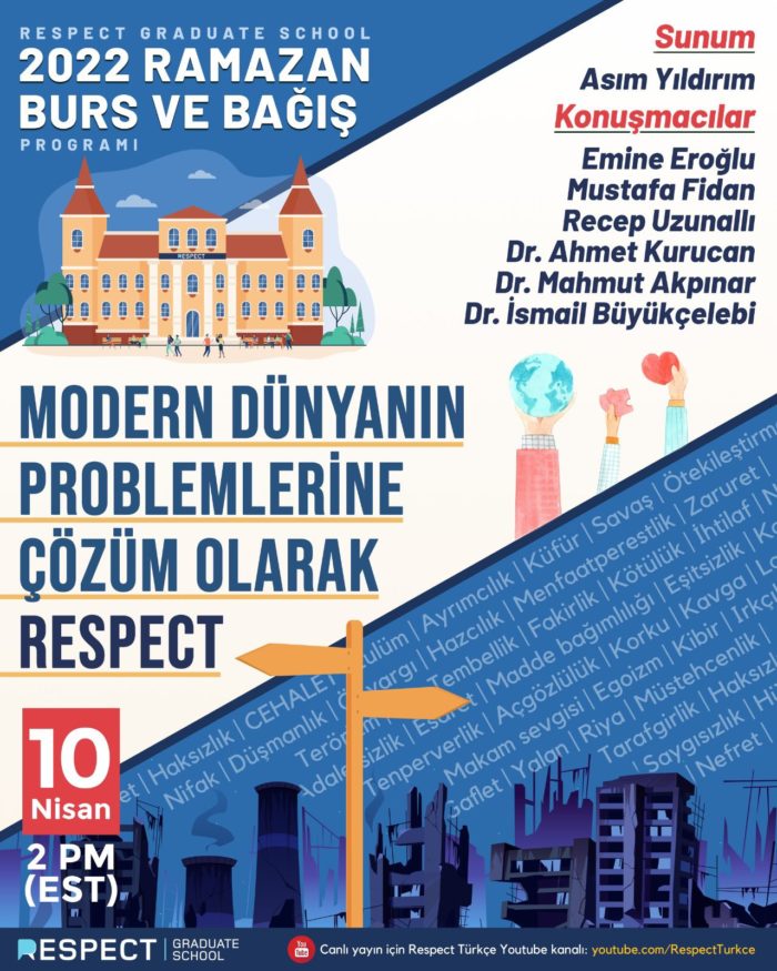 Pazar günü Respect Youtube kanalından canlı yayınlanacak programa Emine Eroğlu, Dr. İsmail Büyükçelebi, Recep Uzunallı, Mustafa Fidan, Dr. Ahmet Kurucan ve Dr. Mahmut Akpınar konuşmacı olarak katılacak. Asım Yıldırım’ın sunacağı yayın ve New York saatine göre öğleden sonra saat 14.00’te başlayacak.