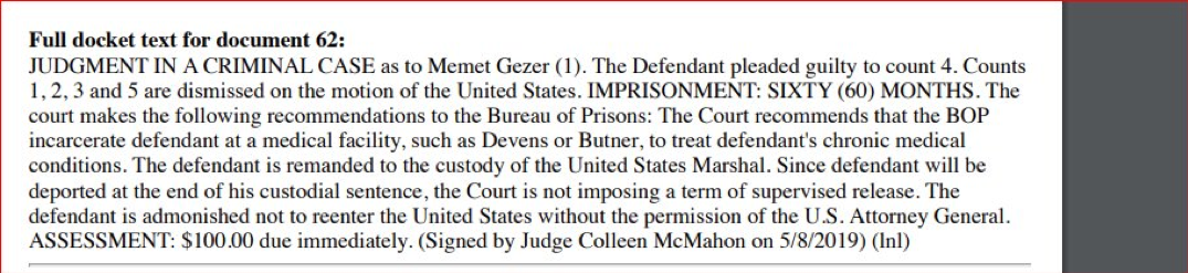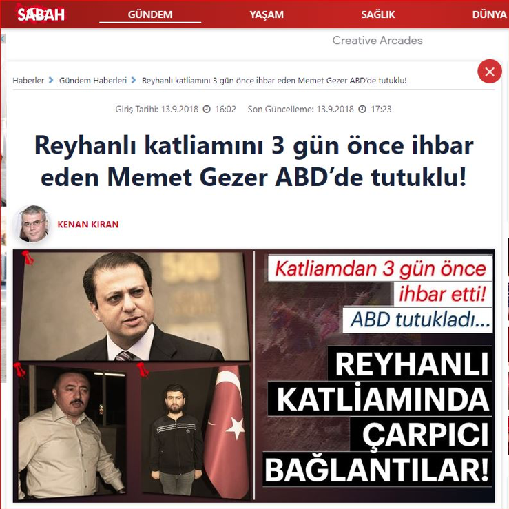 “Şüphelinin (Memet Gezer), savcı Özcan Şişman’ın (Reyhanlı katliamında ihmali olduğu ortaya çıkmıştı) kasıtlı ihmali sonucu vuku bulan bombalı saldırılardan FETÖ/PDY mensupları yerine devletin güvenlik ve istihbarat birimlerinin sorumlu olmasını gerektirecek şekilde oluşturulan kurgu ve mizansen içinde yer aldığı, bu eylem ve olaylara ilişkin bulgu ve bilgileri yetkisi olmayan kurum ve kuruluşlara verdiği, New York Güney bölgesi mahkemesindeki davada tanık olarak dinleneceğine dair bilgilere ulaşılmıştır.”