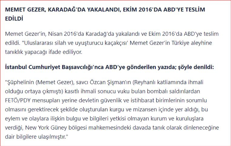 Nitekim Saray’ın gazetesi Sabah’ta aynen şu ifadeler yer aldı: “Türk istihbarat birimleri, Karadağ’da Nisan 2016’da yakalanıp, Ekim 2016’da ABD’ye teslim edilen ‘uluslararası silah ve uyuşturucu kaçakçısı’ Memet Gezer’in Türkiye aleyhine tanıklık yapacağı bilgisine ulaştı.”