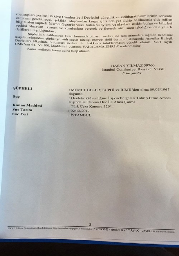 İstanbul Cumhuriyet Savcılığı 28 Aralık 2017’de Memet Gezer hakkında “Devletin güvenliğine ilişkin belgeleri tahrif etme, amacı dışında kullanma, hile ile alma-çalma” suçunu işlediği gerekçesiyle yakalama kararı çıkarılmasını talep etti. İstanbul 2. Sulh Ceza Hakimliği de ABD’de tutuklu bulunan Gezer ile ilgili yakalama kararı çıkardı.