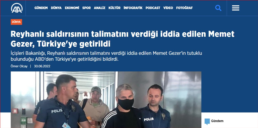 Anadolu Ajansı kısa bir haberle Memet Gezer’in tutuklu bulunduğu ABD’den Türkiye’ye getirildiğini duyurdu.