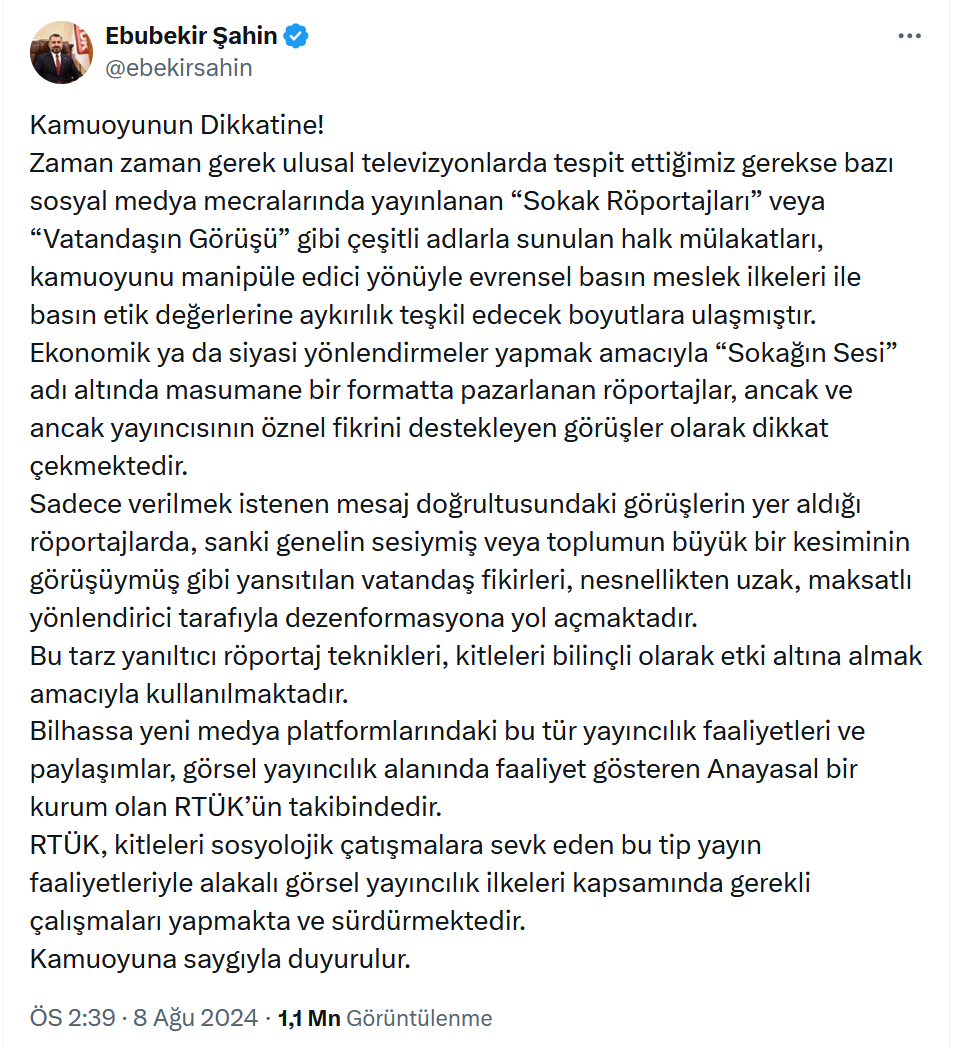 Ebubekir Şahin, sosyal medya hesabından yaptığı açıklamada, zaman zaman ulusal televizyonlarda tespit ettikleri ve bazı sosyal medya mecralarında yayınlanan, “sokak röportajları” veya “vatandaşın görüşü” gibi başlıklarla yayımlanan röportajların, kamuoyunu manipüle edici yönüyle evrensel basın meslek ilkeleri ile basın etik değerlerine aykırılık teşkil edecek boyutlara ulaştığını öne sürdü.