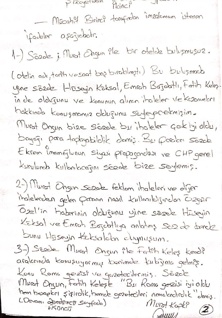 - Bugün kuruluşunu kutladığımız AKP’nin MKYK üyeliği dahil, çok sayıda görev yapmış Mücahit Birinci denilen arkadaş gider. Murat Kapki’yle konuşur. 31 Temmuz 2025 günü, 1,5 sayfalık bir ifade tutanağını önüne koyup, “Bunu imzalayacaksın, 2 milyon milyon Dolar da vereceksin. Ondan sonra buradan çıkıp gideceksin.” der. Olmayan bir buluşmayı olmuş gibi söylemesini, çeşitli kişilerin isimlerini geçirmesini ister.