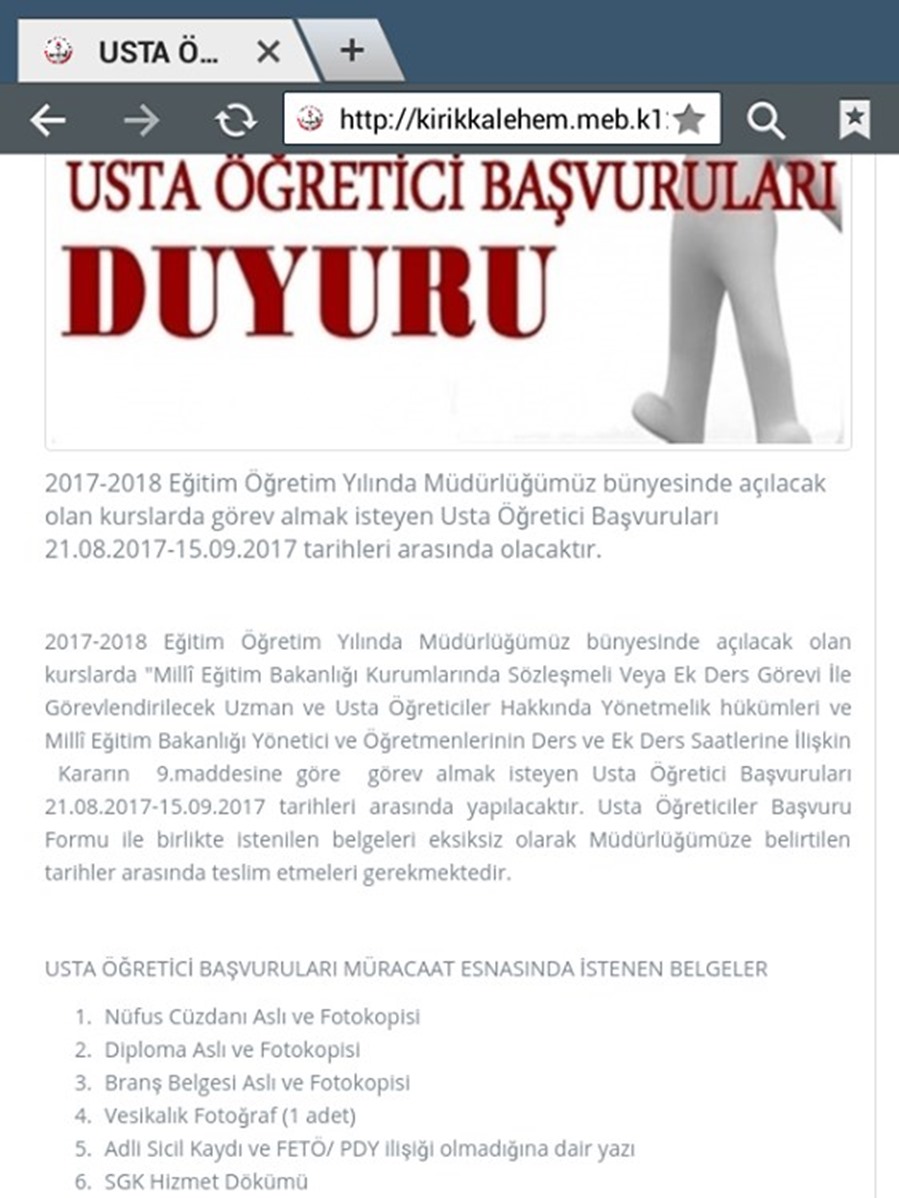 Kırıkkale Halk Eğitim Müdürlüğü’nün resmi internet sitesinde usta öğretici alımları için yapılan duyuruda, 15 Eylül’de sona erecek başvurularda, nüfus cüzdanı, diploma, branş belgesi, fotoğraf, SGK hizmet dökümü, aile yardım beyannamesi, spor kurslarında ilgili federasyondan yazı ve adli sicil kaydı istendi. Her başvuru sırasında istenen ve kanunen zorunlu olan bu belgelerle birlikte, sözde “F…/PDY ilişiği olmadığına dair yazı” da istenen belgeler arasında yer aldı. Bu belgenin nereden alınabileceği ise belirtilmedi.