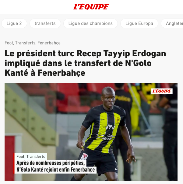 Fenerbahçe’nin Fransa Milli Takımı’nın orta saha oyuncusu Ngolo Kanté transferinin sonuçlanması için AKP’li Cumhurbaşkanı Recep Tayyip Erdoğan’ın sürece dahil olması Fransız basınında yer buldu. Fenerbahçe, transferin olumlu sonuçlanmasının ardından yaptığı paylaşımda, Erdoğan’a teşekkür etmişti.
