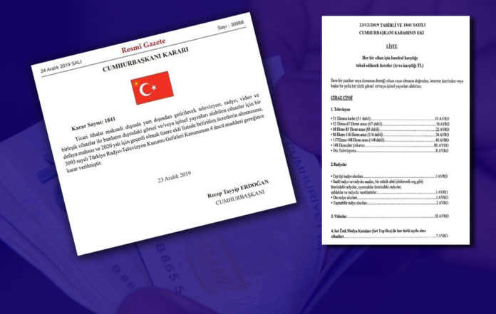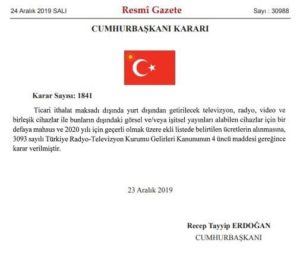 Yurt dışından yolcu beraberinde ya da siparişle getirilen televizyon, radyo, video ve birleşik cihazlar ile bunların dışındaki görsel ve işitsel yayınları alabilen cihazlar için bir defaya mahsus olmak üzere 2020 yılından itibaren geçerli olacak şekilde ücret alınmasına karar verildi. Karar Resmi Gazete’de Cumhurbaşkanı Recep Tayyip Erdoğan’ın imzasıyla yayımlandı.