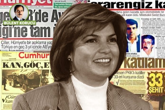 “Leydi’nin topuk sesi”ni duyan ve ona göre konumlananlar arasında Hürriyet ve onun illüzyonist yayın yönetmeni Ertuğrul Özkök de vardı. Gazeteci Yavuz Gökmen’in daha sonra kitabının da adını alacak olan “Sarışın güzel kadın” bir umut olarak kitlelere sunuldu. Çağdaş, özgürlükçü ve toplumu kucaklayacak kadınsı bir siyaset bekleyenler kısa sürede hayal kırıklığına uğradı. Topuklu leydi ambalajından, çizmeli, eli kırbaçlı bir hanımağa çıktı. Çiller, literatüre 90’lı yıllar olarak geçen Demirel’in tabiriyle ‘rutin dışına çıkan’ devletin en kirli dönemlerinden birinin başaktörü oldu.