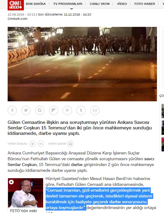 Yani aslında ortada ne bir faaliyete geçme vardı ne de darbe vardı. Fakat iddianamede savcı, sanki darbe girişimi olmuş bitmiş gibi hüküm içeren bir cümleye yer vermişti. Medya 15 Temmuz’dan sonra bunu, “Savcıdan darbe uyarısı… Hem de 2 gün önce” başlıkları ve “Savcı Serdar Coşkun darbeyi 2 gün önceden uyardı” övgüsü ile sunmuştu. Oysa ortada skandal bir durum vardı.
