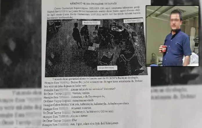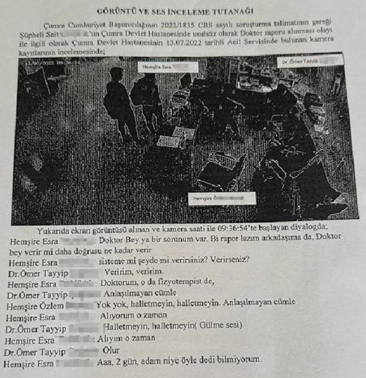 Konya Cumhuriyet Başsavcılığı’nın, olayla ilgili başlattığı soruşturmada hastanedeki görüntü ve sesli güvenlik kamera kayıtları incelendi. Görüntülerde hemşire Esra T’nin bir arkadaşına raporun lazım olduğunu söylediği, doktor Ömer Tayyip Ç’nin ise “Veririm olur.” dediği tespit edildi. Görüntüler aracılığıyla Sait U’nun o gün hastanede olmadığı saptandı. Bilgi Teknolojileri ve İletişim Kurumu’ndan alınan raporda da Sait U’nun olay günü Esra T’yi 3 kez telefonla aradığı ve baz istasyonu sinyallerine göre de Mersin’de olduğu belirlendi.