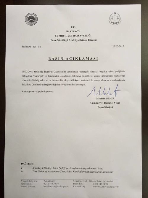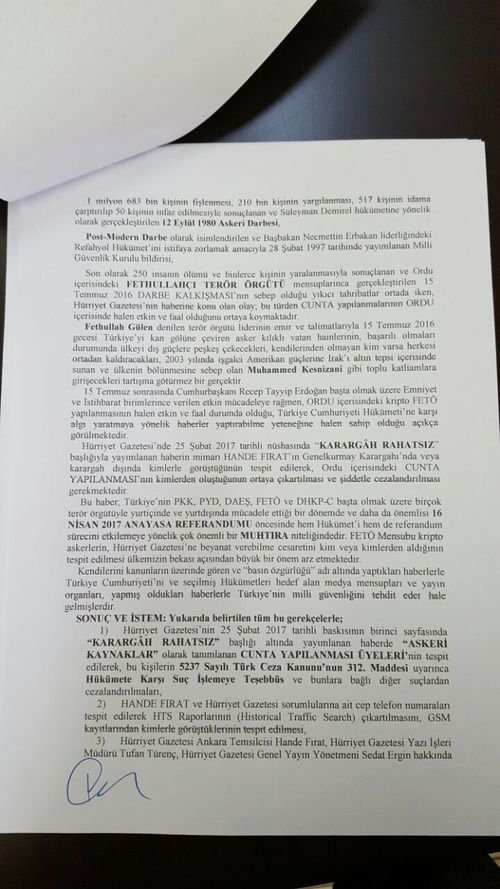 Bakırköy Cumhuriyet Başsavcılığı’na verilen şikayet dilekçesinde ise “Devletin güvenliğine karşı suçlar” ve “Anayasal düzene ve bu düzenin işleyişine karşı suçlar” kapsamında Hürriyet gazetesine ‘el koyma işlemi başlatılması’ istendi.