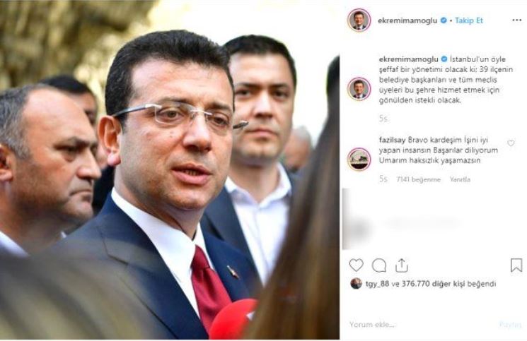Fazıl Say, İmamoğlu’nun Instagram hesabından, “İstanbul’un öyle şeffaf bir yönetimi olacak ki; 39 ilçenin belediye başkanları ve tüm meclis üyeleri bu şehre hizmet etmek için gönülden istekli olacak” notuyla paylaştığı fotoğrafa yorum yaptı. Say yorumunda, “Bravo kardeşim. İşini iyi yapan insansın, başarılar diliyorum. Umarım haksızlık yaşamazsın.” ifadesini kullandı.