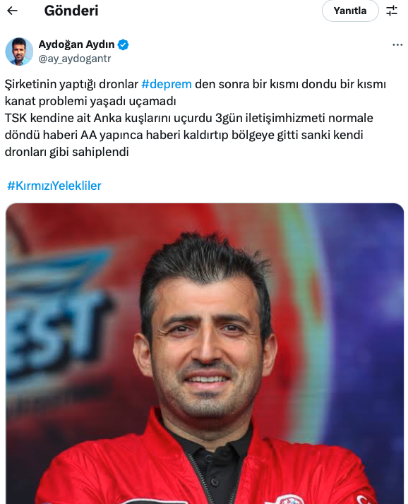 Aydın, depremden 10 gün sonra 17 Şubat 2023’te X’ten yaptığı paylaşımda, Baykar Teknoloji Yönetim Kurulu Başkanı Selçuk Bayraktar’ın ürettiği İHA ve SİHA’ların bir kısmının depremden sonra donduğunu, kanat problemi yaşadığı için uçamadığını, TSK’nın Anka kuşlarını uçurduğunu yazmıştı.