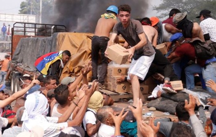 Muhaliflerin talep ettiği insani yardımı taşıyan kamyonlardan biri Venezuela-Kolombiya sınırının Venezuela tarafında polis tarafından ateşe verildi. Venezuealılar yanan kamyondan yardım malzemesi alabilmek için birbirleriyle ve zamanla yarıştı.
