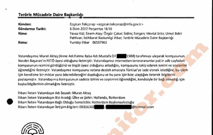 Dışişleri Bakanlığı da gelen ihbarı İçişleri Bakanlığı ile paylaşıyor. Nordic Monitor’ün elde ettiği mailde şu bilgiler yer alıyor: “Vatandaşımız Murat Aktaş tarafımıza ulaşarak komşusu Necdet Başaran’ın FЕТÖ üyesi olduğunu iletmiştir. Vatandaşımız internette teror arananlar adlı sayfadan komşusunun resmini gördüğünü, örgüt üyesi olduğunu anladığını, komşusunu takip ederek ismini-soyismini ögrendiğini iletmiştir.”