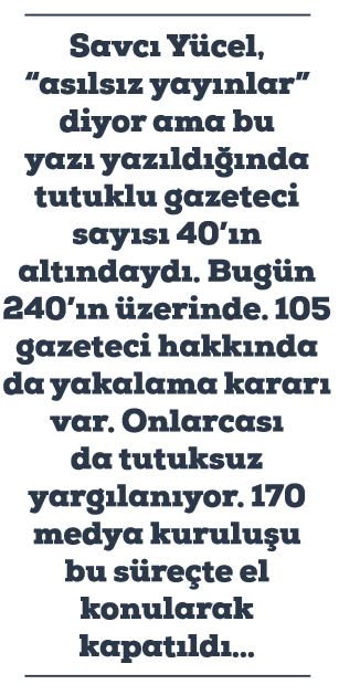 Savcı Yücel, “asılsız yayınlar” diyor ama bu yazı yazıldığında tutuklu gazeteci sayısı 40’ın altındaydı. Bugün 240’ın üzerinde. 105 gazeteci hakkında da yakalama kararı var. Onlarcası da tutuksuz yargılanıyor. 170 medya kuruluşu bu süreçte el konularak kapatıldı…