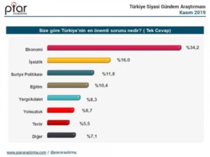 Piar’ın araştırmasına katılanların yüzde 34.2’si “Size göre Türkiye’nin en önemli sorunu nedir?” sorusuna “ekonomi” yanıtı verirken, onu yüzde 16 ile “işsizlik”, yüzde 11 ile “Suriye politikası” ve yüzde 10.4 ile “eğitim” izledi.
