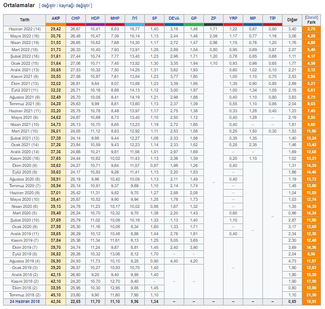 AKP en az oyu ise Yöneylem ve ORC’nin anketlerinde alıyor; yüzde 27,1. Yöneylem’in son anketinde CHP yüzde 27,7 oy alırken, ORC’nin anketinde ise yüzde 24’te kalmış gözüküyor.