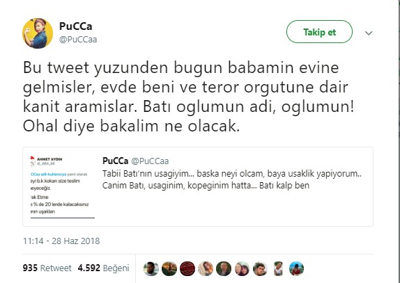 Kadın erkek ilişkilerine dair kendi tanıklıkları ve yaşadıkları üzerinden kaleme aldığı kitaplarla bilinen Pucca , kişisel Twitter hesabında yaptığı paylaşımda, “Bugün babamın evine gelmişler, evde beni ve terör örgütüne dair kanıt aramışlar. Batı oğlumun ad adı, oğlumun! OHAL diye bakalim ne olacak” ifadelerini kullandı. Pucca , polislerin ailesine oğlunun adının neden Batı olduğunu sorduklarını da aktardı.
