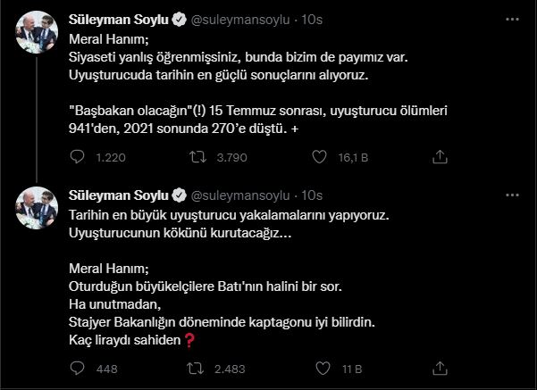 - Meral Hanım; siyaseti yanlış öğrenmişsiniz, bunda bizim de payımız var. Uyuşturucuda tarihin en güçlü sonuçlarını alıyoruz. “Başbakan olacağın”(!) 15 Temmuz sonrası, uyuşturucu ölümleri 941’den, 2021 sonunda 270’e düştü.
