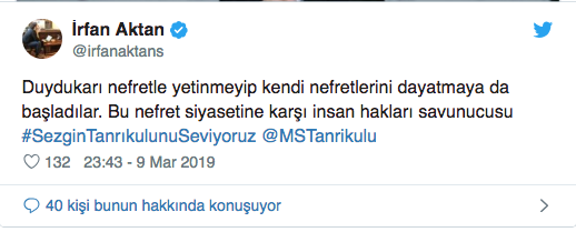 Nefret söyleminin nereye varabileceğini geçmiş örneklerden bildiklerini söyleyen Tanrıkulu, “Geçmişte de onun ‘büyük abilerinden’ çok tehdit aldık ama yolumuzdan dönmedik. Ben işimi yapmaya, adalet, insan hakları ve hukuk için çalışmaya ve her mağdurun hakkını savunmaya devam edeceğim. Allah kerim” dedi.