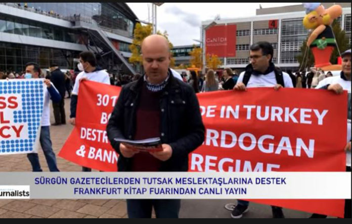 Dünyanın en önemli uluslararası kitap fuarı olarak kabul edilen Frankfurt Kitap Fuarı, bu yıl farklı bir etkinliğe ev sahipliği yapıyor. Hafta sonu kapılarını halka açan fuarda sürgün gazeteciler, Türkiye’de rejimin elinde ‘esir’ bulunan gazeteci arkadaşları için yürüdü. Etkinlikteki basın açıklaması hem İngilizce hem Almanca olarak yapıldı.