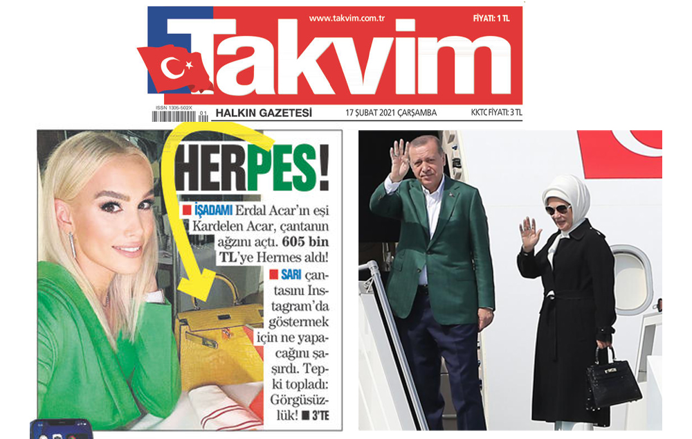 İktidara yakın Takvim gazetesi ‘Hermes’ çanta haberi yaptı. Ancak haberin öznesi Hermes markanın müdavimlerinden Emine Erdoğan değil; İşadamı Erdal Acar’ın eşi Kardelen Acar. Haberde, “Daha önce 9 yardımcısı ve servetlik tektaşıyla hava atan Kardelen Acar’ın görgüsüzlük şovu sürüyor. Acar, önceki gün de 72 bin euro yani 605 bin TL’lik Hermes çantasını Instagram’da göstermek için girmedik şekil bırakmadı!” ifadeleri kullanılıyor.