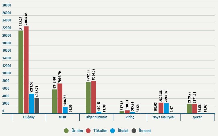 İthalat rakamları (üretimin tüketimi karşıladığı şeker de dahil) ihracatın üzerinde.2018 yılında en çok tüketilen tarım ürünü buğdayda görülen üretim artışı, tüketimdeki artışın gerisinde kalıyor. Mısırda ise artan ithalat rakamlarına karşı ihracatın azaldığı görülüyor.