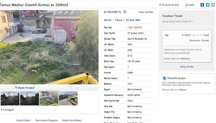 Kazının başlayıp, bitmesine rağmen vatandaşların ilgi gösterdiği ve ‘gizemli ev’ adını verdiği müstakil ev için alım-satım sitesinde satış ilanı verildi. 27 Şubat tarihli ‘Tarsus meşhur gizemli kırmızı ev 209 metrekare” başlıklı ilanda, ev için 6 milyon 750 bin lira istendiği görüldü.