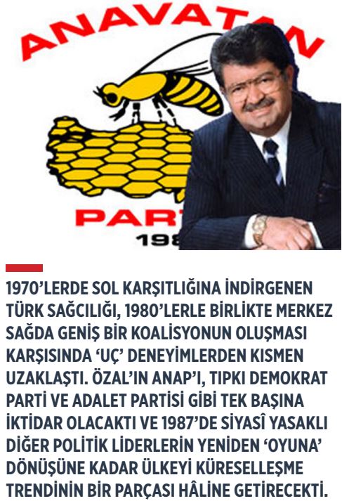 1970’lerde sol karşıtlığına indirgenen Türk sağcılığı, 1980’lerle birlikte merkez sağda geniş bir koalisyonun oluşması karşısında ‘uç’ deneyimlerden kısmen uzaklaştı. Özal’ın ANAP’ı, tıpkı Demokrat Parti ve Adalet Partisi gibi tek başına iktidar olacaktı ve 1987’de siyasî yasaklı diğer politik liderlerin yeniden ‘oyuna’ dönüşüne kadar ülkeyi küreselleşme trendinin bir parçası hâline getirecekti. 1950’de Demokrat Parti’nin ABD’yle ekonomik işbirliğinin neticesinde ‘istikrar’ getiren kalkınmacı bir sağ parti olarak görülmesi gibi, 1980’lerde de Özal’ın ANAP’ı, ABD ile yakın işbirliği ve uluslararası finans çevreleriyle kurulan iyi ilişkiler neticesinde evvela ekonomik iyileşmeyi başardı. Son tahlilde, Türk sağcılığı uzun yıllar seçmenine kalkınma, ekonomik istikrar ve çevreden merkeze doğru hareket etme imkânı sunabildi. Bu da orta ve alt sınıfların, solcuların beklentilerinin aksine genelde ‘sağ’ politikalar belirleyen partilere yönelmesini sağladı.