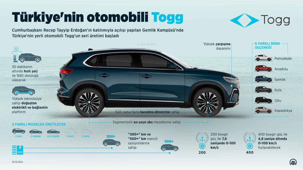 TOGG’un ilk olarak C-SUV modeli üretilecek. TOGG’un CEO’su Gürcan Karakaş, “SUV’dan sonra ne var? Sedan, hatchback ve hafif ticari araç olarak kullanılacak seçenekler var. Hachtback yapmaktan vazgeçtik. Cross model hazırlayacağız. 2026’da Cross Coupe geliyor.” dedi.