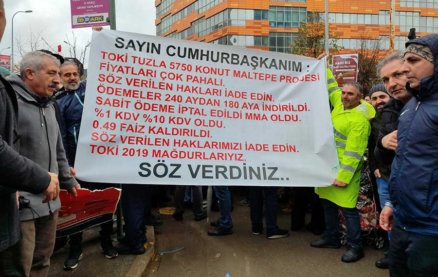 Polisin yoğun güvenlik önlemi aldığı eylemde, “Sayın Cumhurbaşkanım, TOKİ Tuzla 5 bin 750 Konut Maltepe projesi fiyatları çok pahalı. Söz verilen hakları iade edin. Ödemeler 240 aydan 180 aya indirildi. Yüzde 1 KDV yüzde 10 oldu. 0,49 faiz kaldırıldı. Söz verdiniz” yazılı pankart açıldı. Mağdurlar ayrıca, dönemin Çevre, Şehircilik ve İklim Değişikliği Bakanı olan, bugün de AKP’nin İstanbul Büyükşehir Belediye (İBB) Başkan adayı olarak açıklanan Murat Kurum’a da “Mağdurlar burada, Murat Kurum nerede” sloganıyla tepki gösterdi.
