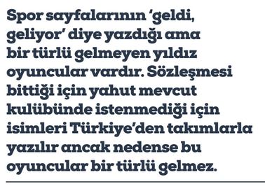 Sezonun bitmesiyle konu sıkıntısı çeken spor sayfalarının yardımına transfer haberlerinin yetiştiği bir dönemdeyiz. Bu dönemde her gün adını şanını duymadığımız oyuncular ya Galatasaray’a ya Fenerbahçe’ye ya da Beşiktaş’a transfer edilir. Bunun yanında bir de spor sayfalarının ‘geldi, geliyor’ diye yazdığı ama bir türlü gelmeyen yıldız oyuncular vardır. Sözleşmesi bittiği için yahut mevcut kulübünde istenmediği için isimleri Türkiye’den takımlarla yazılır ancak nedense bu oyuncular bir türlü gelmez.