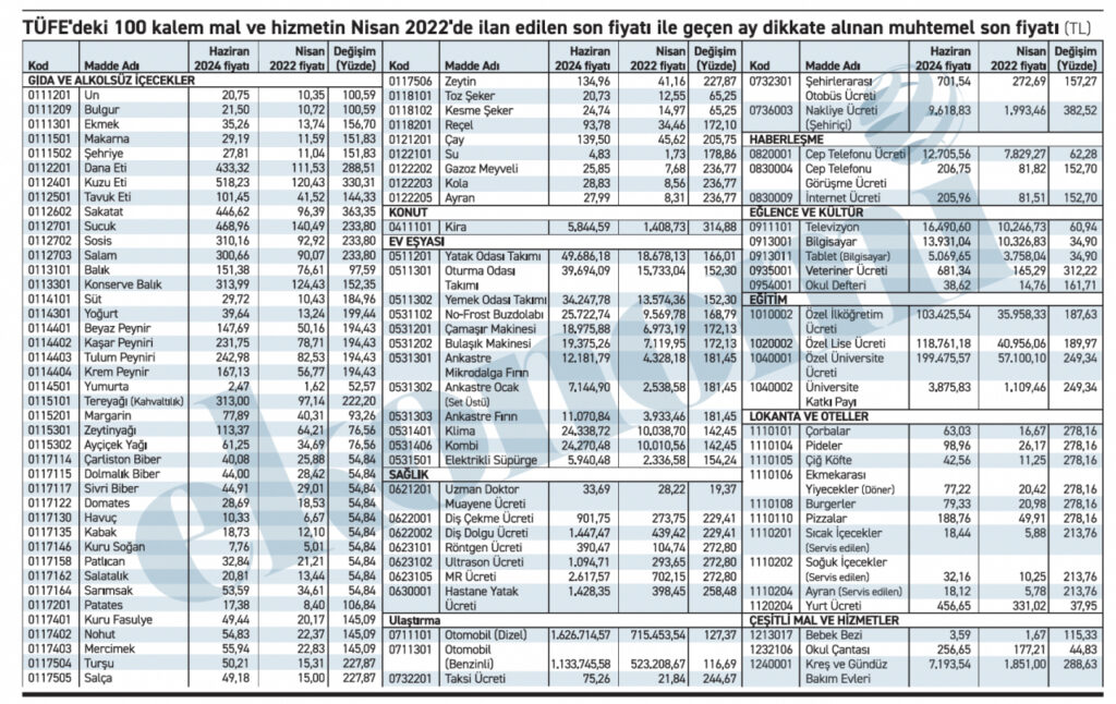 En son açıklanan Nisan 2022 ile Haziran 2024 fiyatları arasındaki çarpıcı rakamlar şu şekilde: